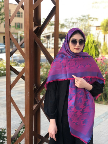 روسری نخ ژاکارد لمه دار قواره۱۴۰ طرح شنل گل سرخابی بنفش