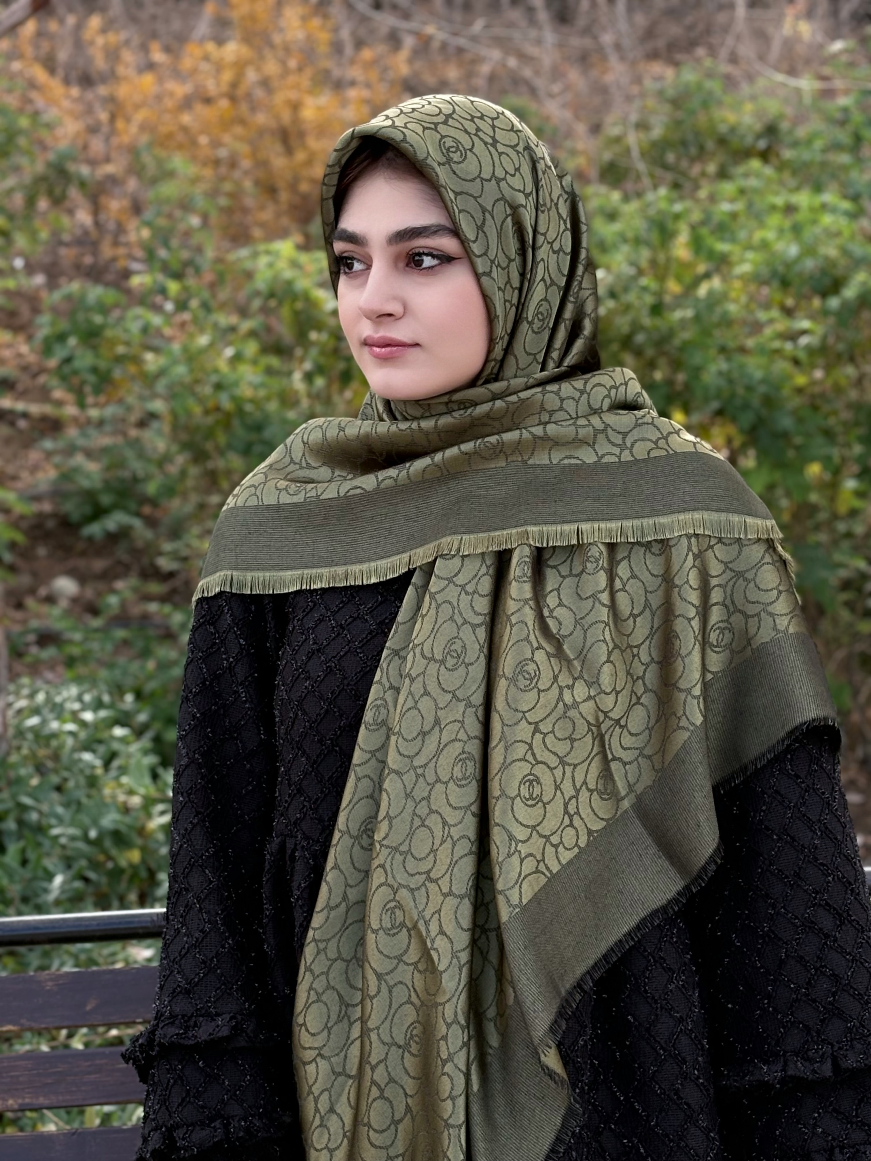 ناموجودروسری نخ ابریشم ژاکارد لمه قواره۱۴۰سبز زیتونی طرح فرفوژه گل