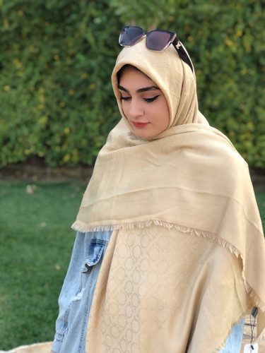 روسری زنانه نخ کشمیر وارداتی طرح ال وی زنجیری قواره۱۴۰ رنگکرمی