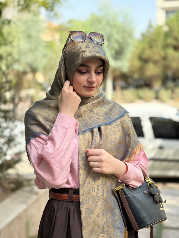 روسری نخ ابریشم ژاکارد لمه قواره ۱۴۰ طرح ال وی کمربندی طلایی سورمه ای