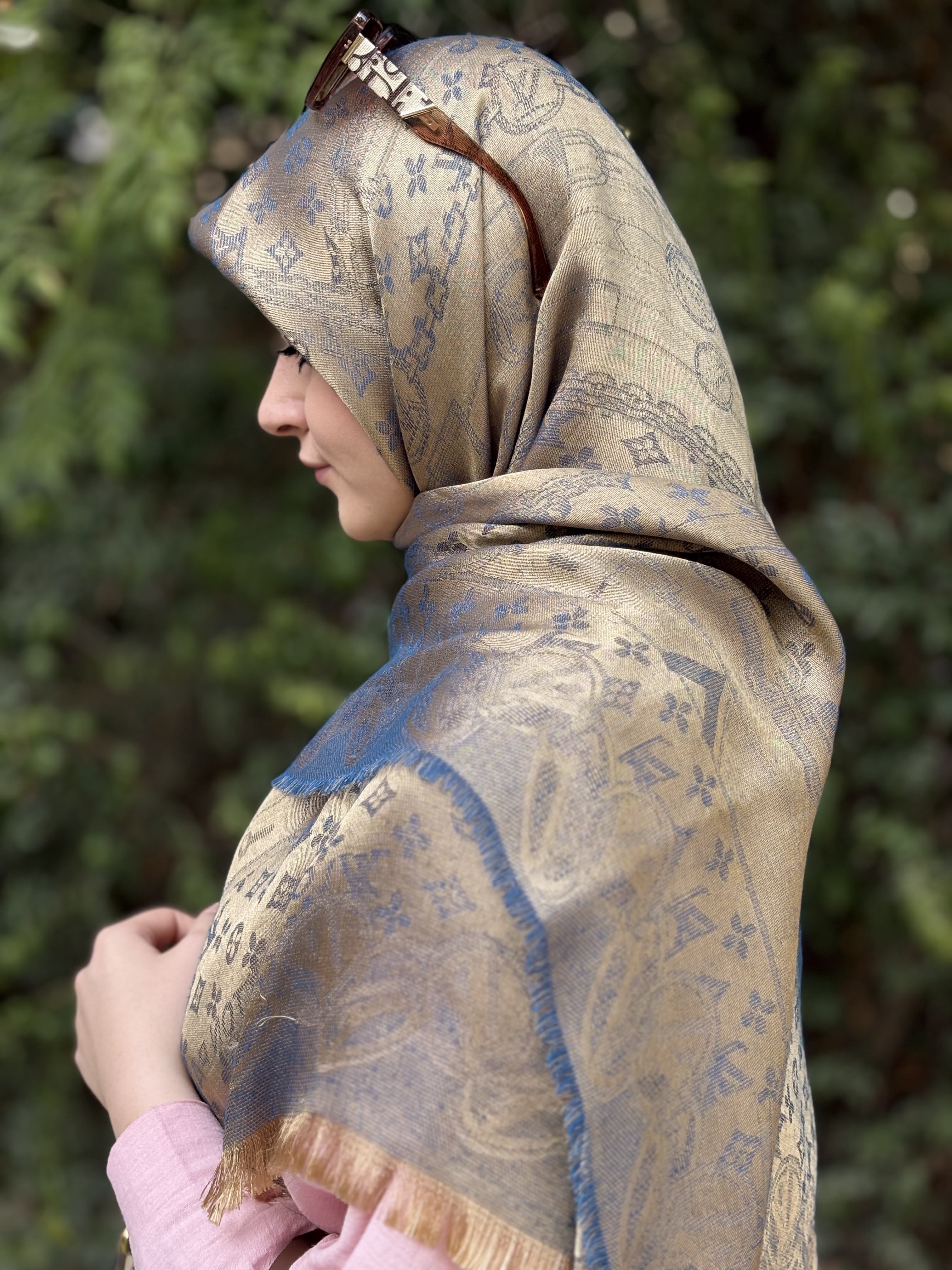 روسری نخ ابریشم ژاکارد لمه قواره ۱۴۰ طرح ال وی کمربندی طلایی سورمه ای