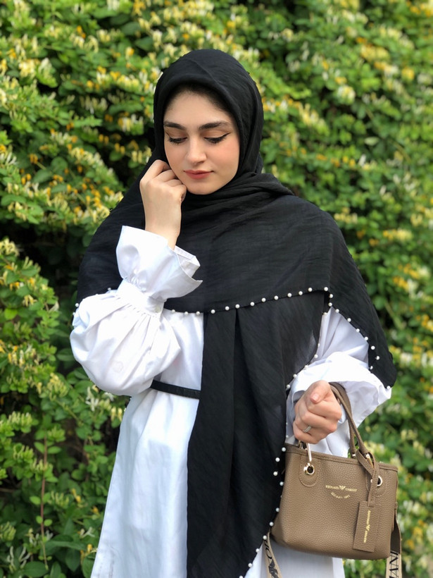 روسری نخ وال اسلپ دور مروارید مشکی که در عکس مروارید سفید میباشد